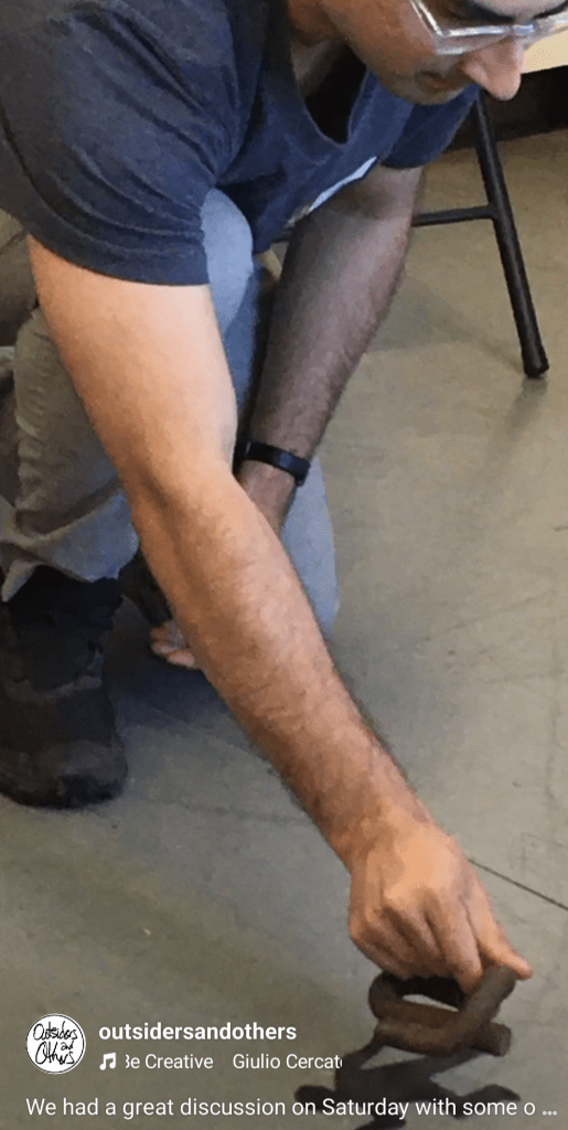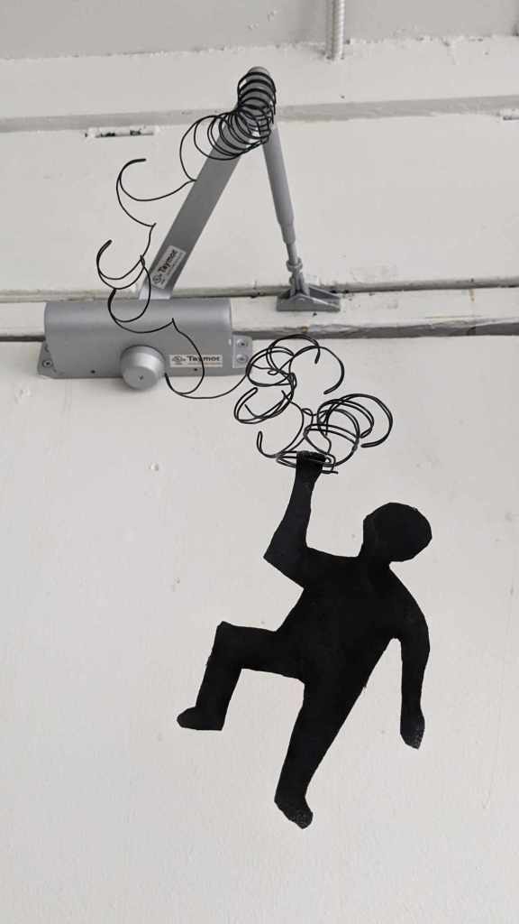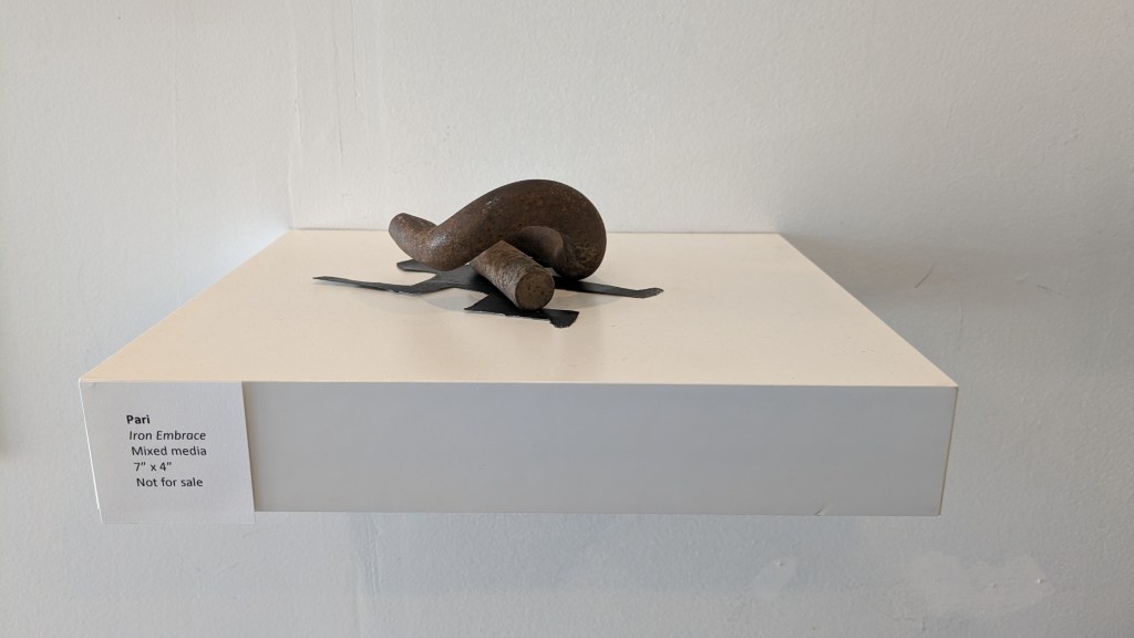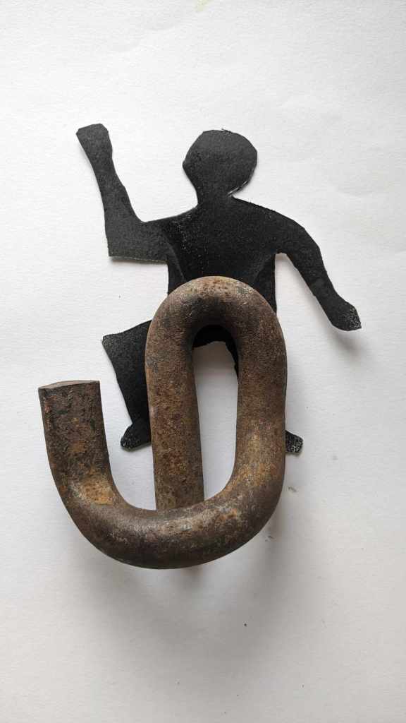 “A key concept I wanted to evoke was movement, inviting viewers to actively engage with the work by positioning the iron piece atop the silhouetted figure—symbolizing the burdens of displacement. I led an artist workshop to demonstrate this interactive element, encouraging participants to explore resonance and dissonance within the configurations. By steering away from prescriptive explanations, I continue to develop a dialogic space that fosters reflection and storytelling with audiences.”